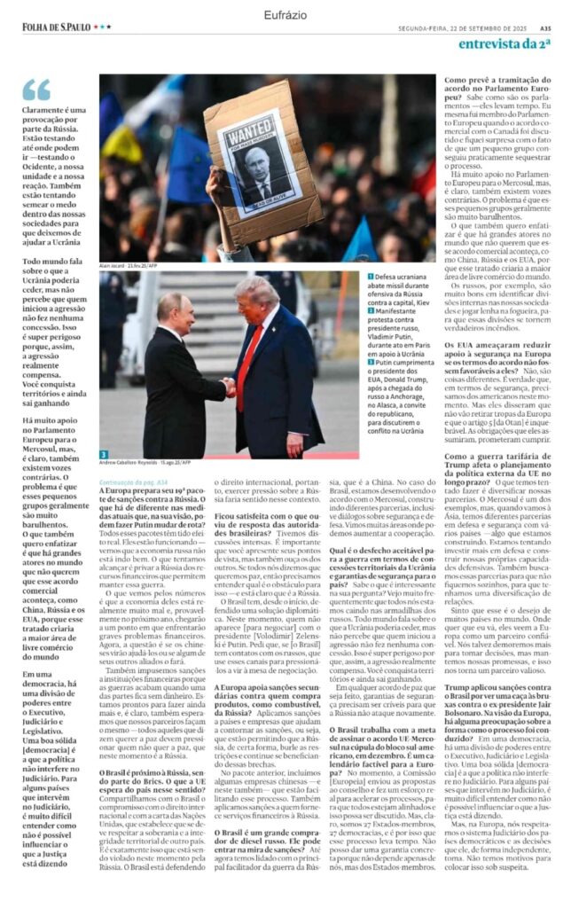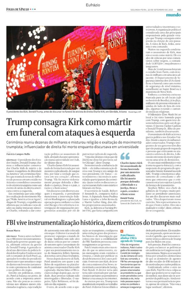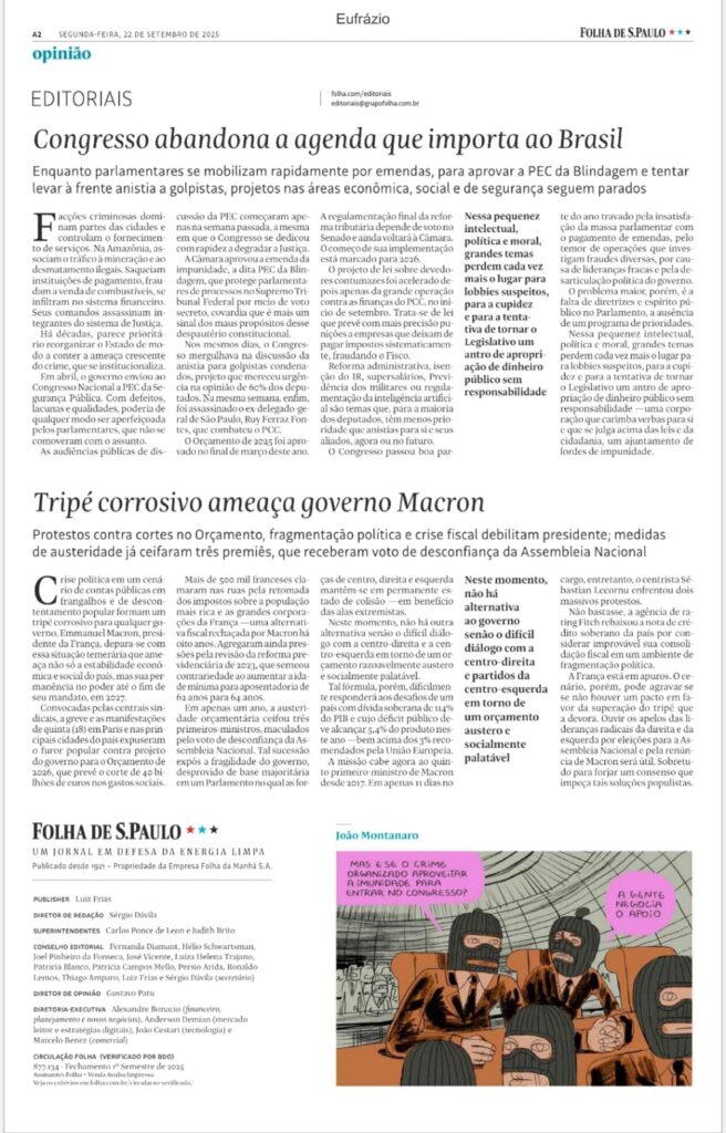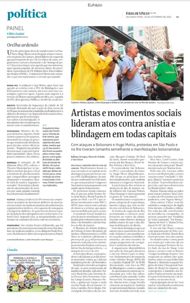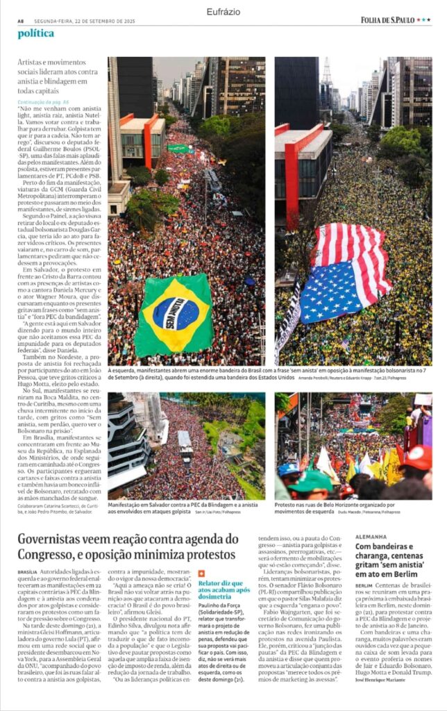 DestaquesDeu na MídiaNotíciasPolitica Deu na Mídia | Folha de S.Paulo 22/09/25: Congresso abandona a agenda que importa ao Brasil; atos contra anistia e blindagem em todas capitais; Palestina é reconhecida por diversas nações 22 de setembro de 2025 Jade Silveira Thomaz Moniz Deixe este campo vazio.Assine nossa newsletter para receber notícias diárias! Verifique sua caixa de entrada ou a pasta de spam para confirmar sua assinatura.