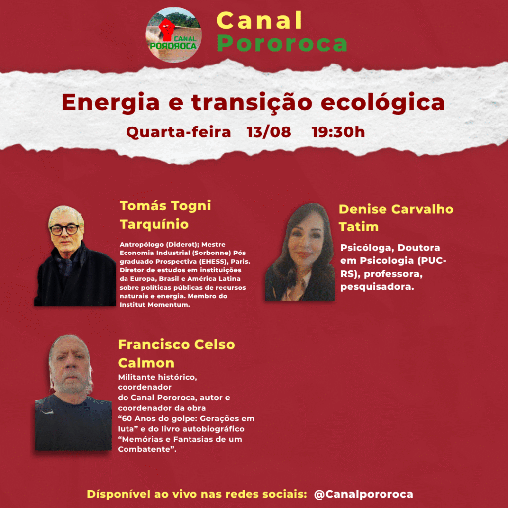 🚩 O Canal ρσяσяσcα esta quarta-feira, às 19:30h (horário de Brasília) recebe os convidados Tomás Togni Tarquínio e Denise Tatim para nossa live sobre energia e transição ecológica